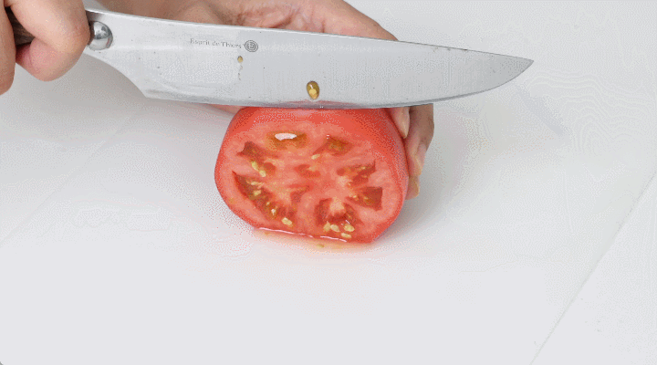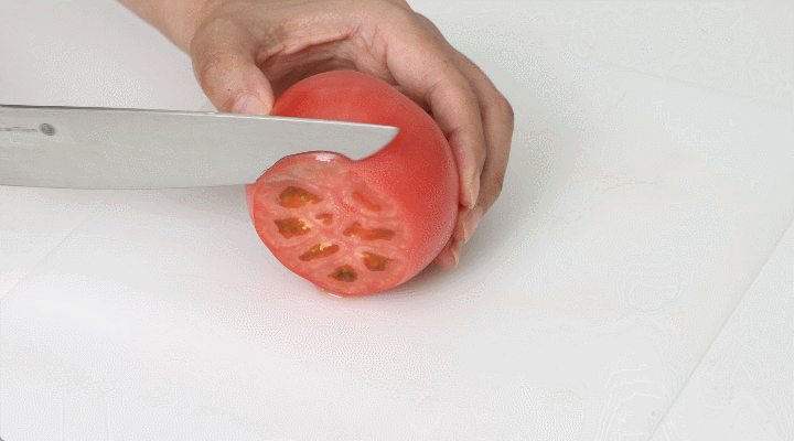 鈍った包丁では厚くしかトマトをスライスできませんが、TOGIMEISTER 刃之匠で研ぎ直した包丁は向こうが透けて見えるほど薄くスライスできます。