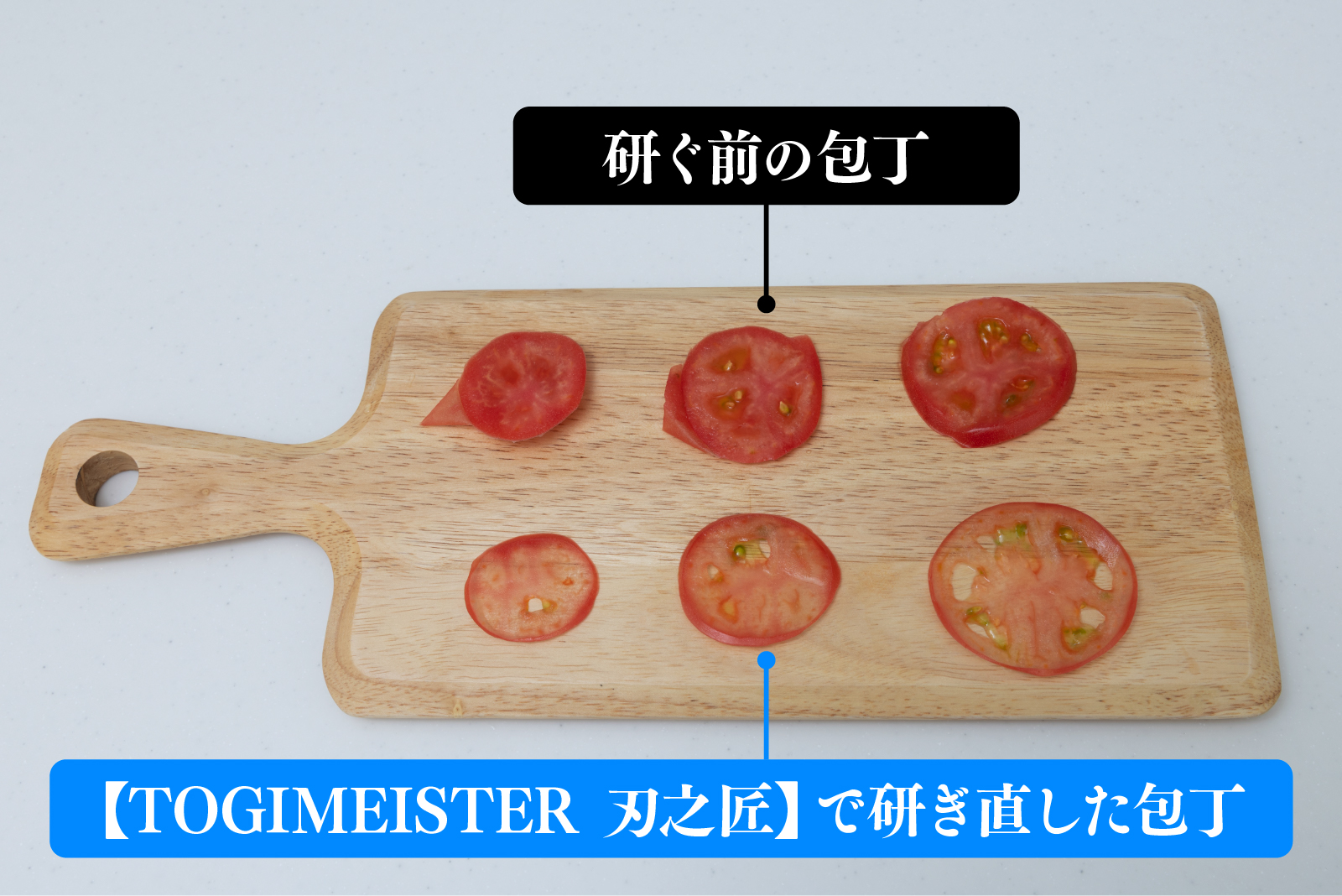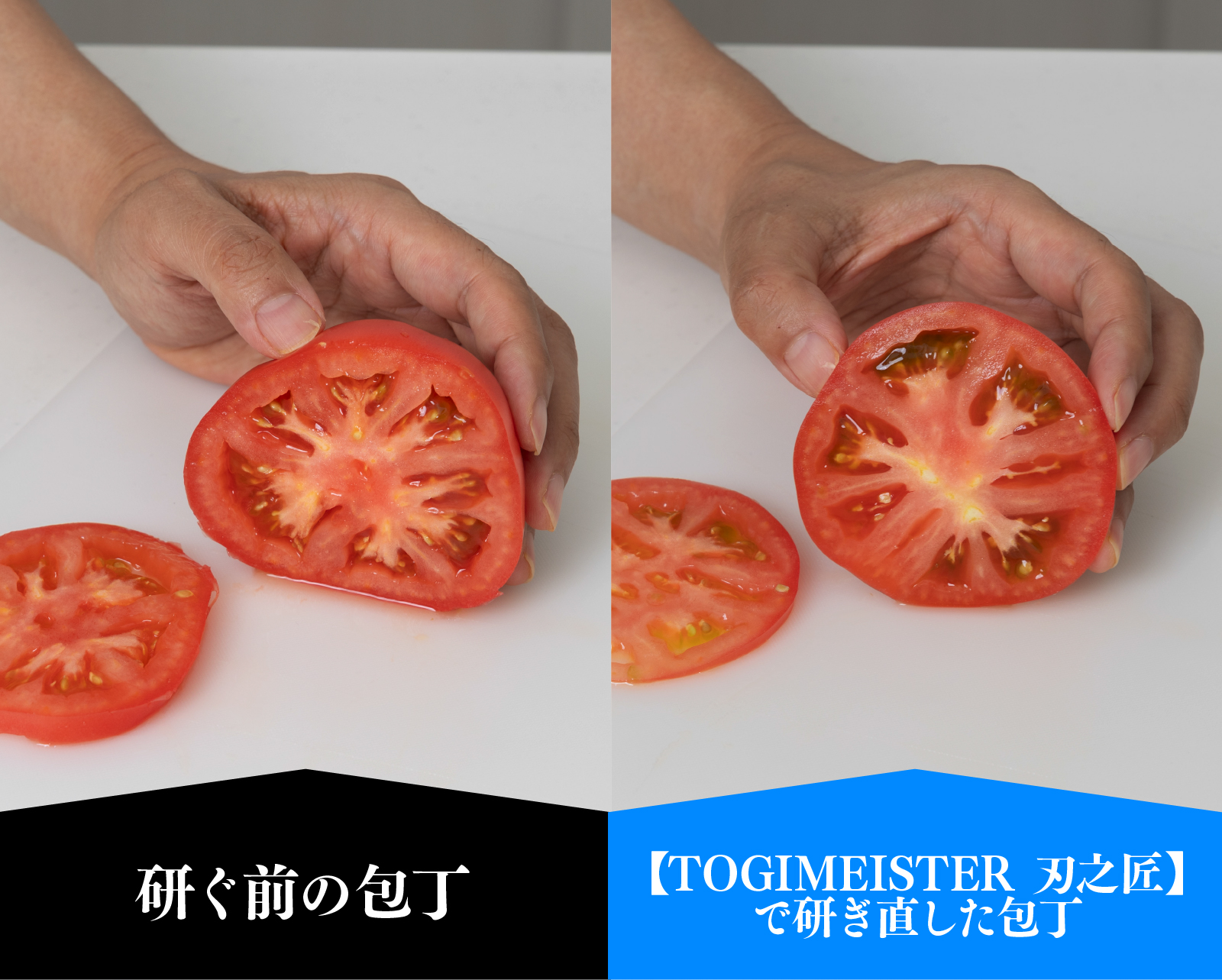 研ぐ前の包丁は刃を充てただけでトマトが潰れ、刃が入りにくいのに対し、TOGIMEISTER 刃之匠で研ぎ直した包丁は刃がスーッと入ります。