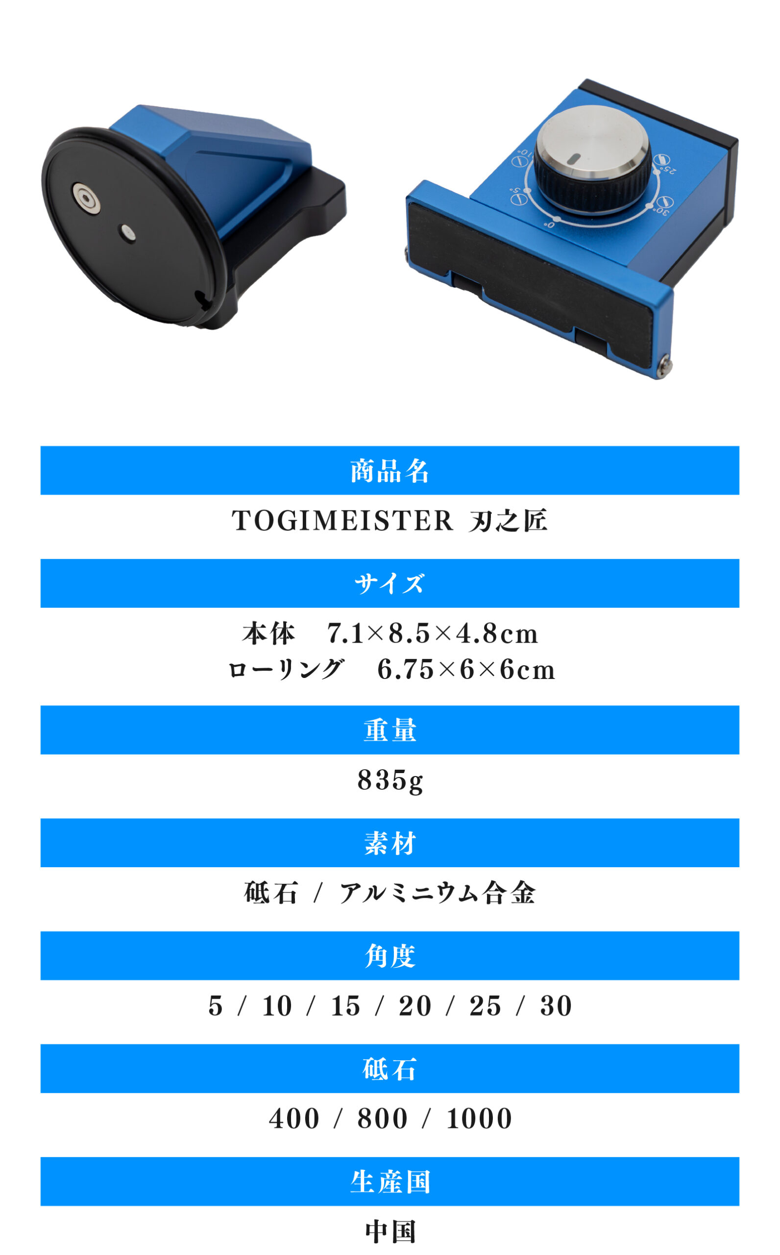 TOGIMEISTER 刃之匠は頑丈なアルミ合金製&アルマイト加工でサビに強い。適度な重さで安定し、凸型ローリングホーンは手で押し当てやすく、扱いも簡単!
