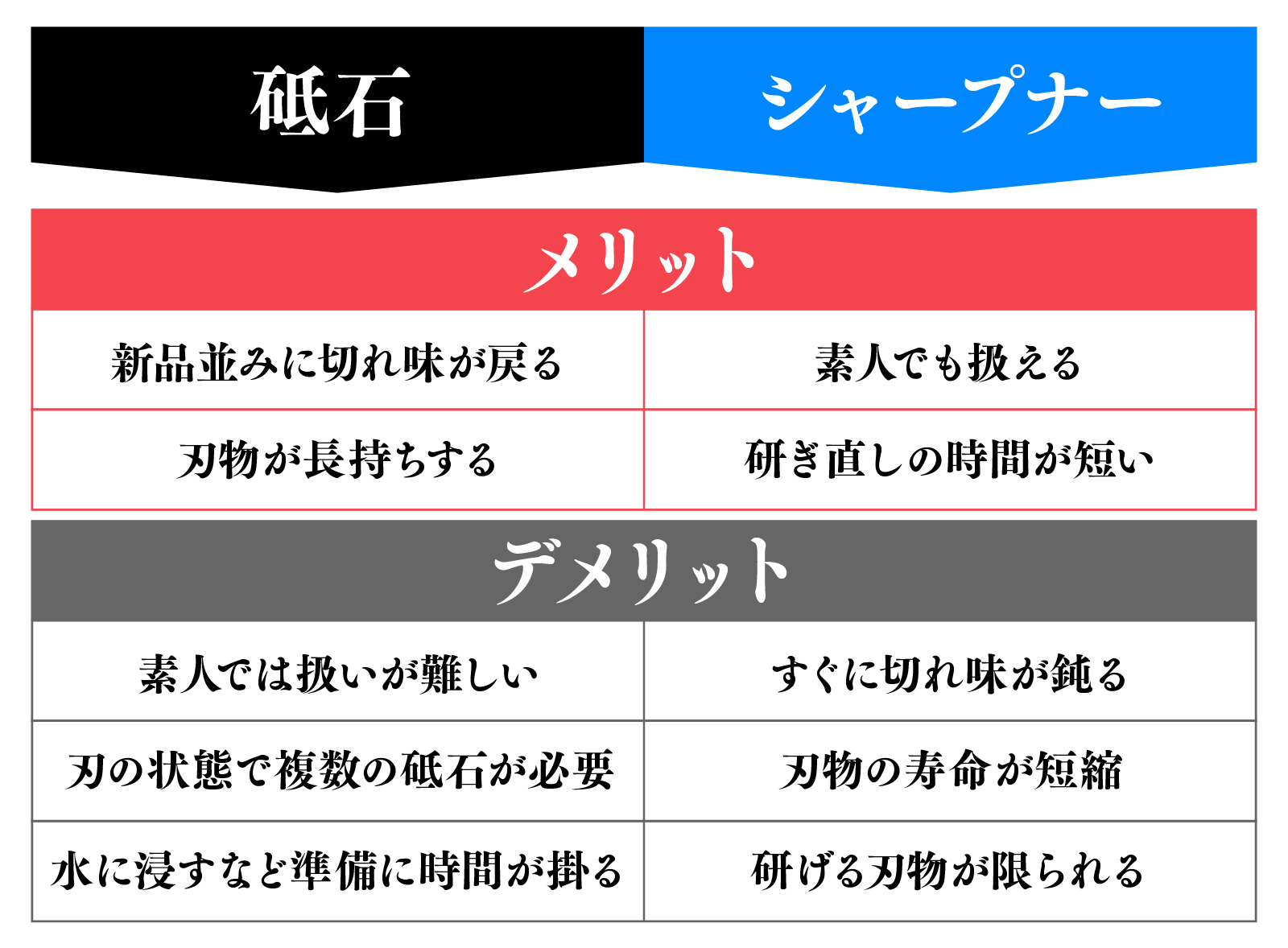 またシャープナーは刃先を「破壊」して小刃付けの代わりにするため、砥石で研ぐ時に比べ、刃物の寿命が縮まります。